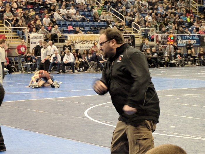 Needing a spark down 20, Carrington got it from 106 Treston Lura at 106. Lura didn’t win, but battled #3 Bowden Greenley to a decision. From there Carrington got bonus points in four matches in a row, plus an upset at 138 from Michael Clifton over Lisbon semifinalist Hunter Schwab on a controversial clasping call at the end of the match. Lisbon was deducted a team point after that match to make the dual score 32-26 Carrington with two matches to go.