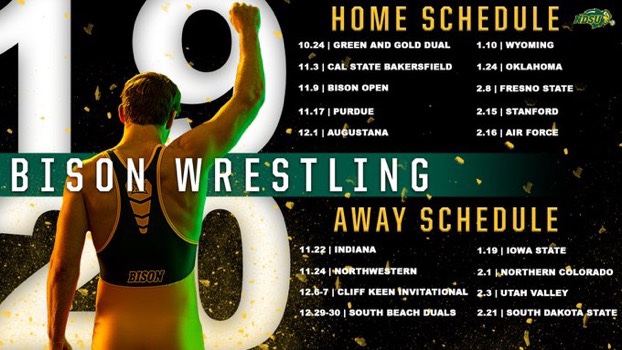 North Dakota State University has released its complete 2019-20 schedule. The Bison will kick things off with their annual Green and Gold dual October 24. Home Big 12 duals include Wyoming, Oklahoma, Fresno State, and Air Force. Also coming to Fargo for duals are Stanford, Purdue, and Augustana. Augustana is in the early stages of a move from Division 1 to Division 2 athletics. The Bison Open is scheduled for November 9.